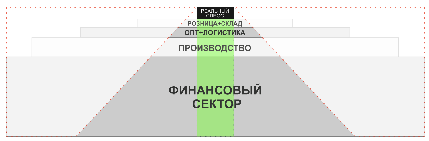 На этом простеньком рисунке (я его сформировал из разных, но вполне доверительных источников, стараясь в первую очередь сохранить пропорции, и поэтому не указываю конкретных цифр) мы видим условное соотношение объема разных рынков (допустим, в финансовом эквиваленте), которые сложились на текущий момент. Как мы видим, классическое перепроизводство относительно реального спроса является сущим пустяком по отношению к надутому финансовому сектору.