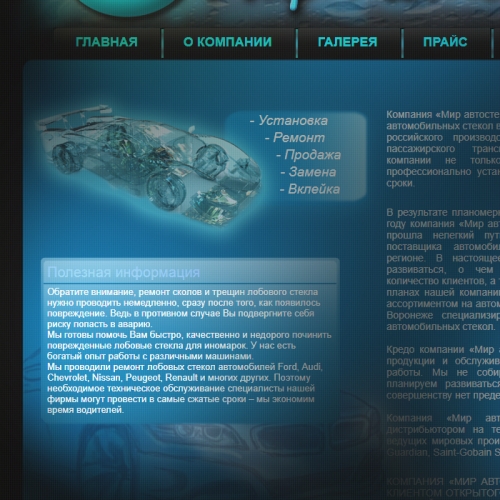 Компания «Мир автостекла Воронеж» работает на воронежском рынке уже более 10 лет и к настоящему времени является крупнейшим поставщиком автомобильных стекол для российских автомобилей и иномарок в Центральном Черноземье. В ближайших планах компании открытие в Воронеже специализированного центра по продаже, установке, замене и тонировке стекол. Кстати, говоря, на сайте уже сейчас имеется информация о данных видах деятельности, облегчающая выбор стекол и поясняющая необходимость их ремонта или замены.